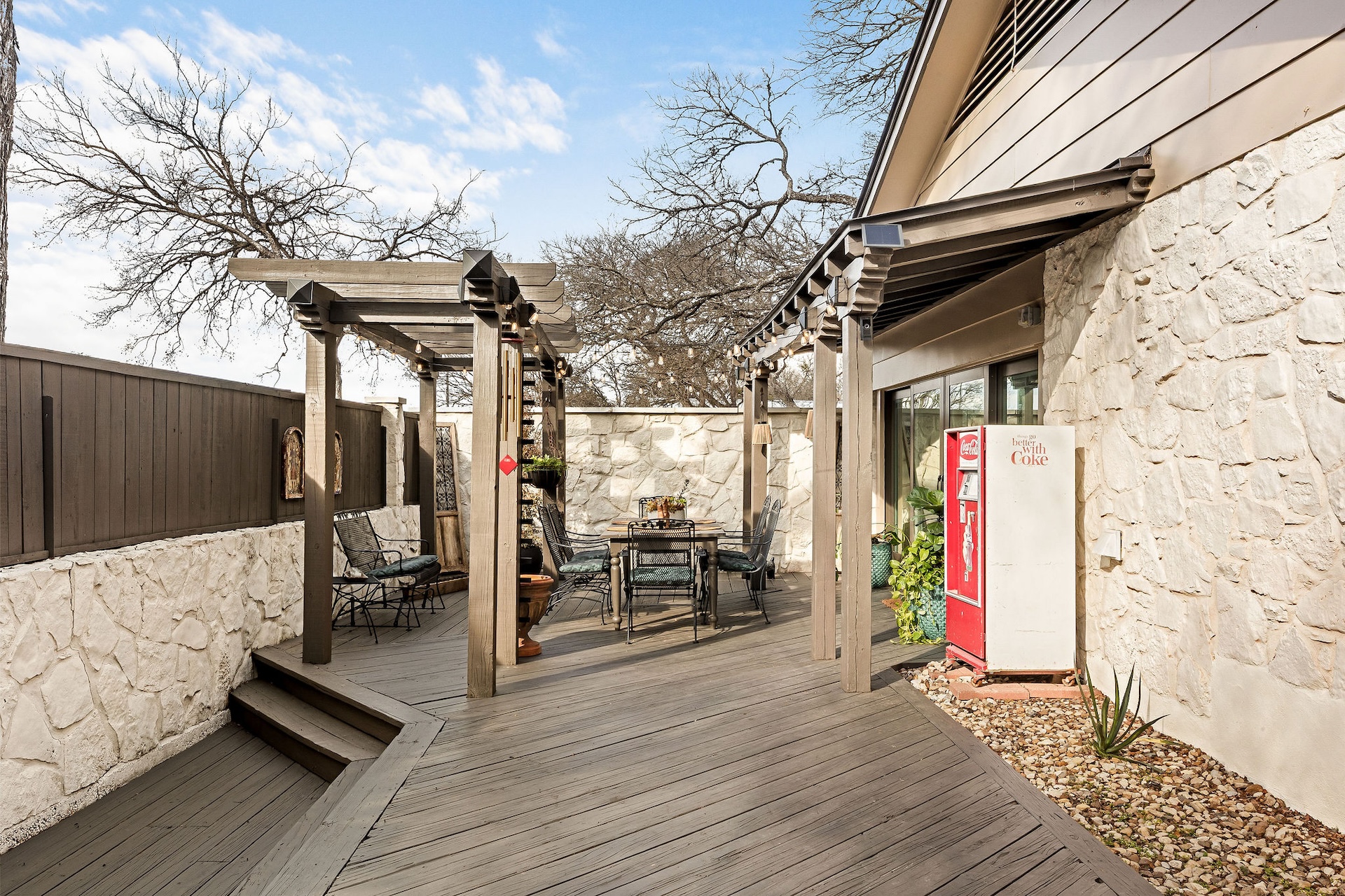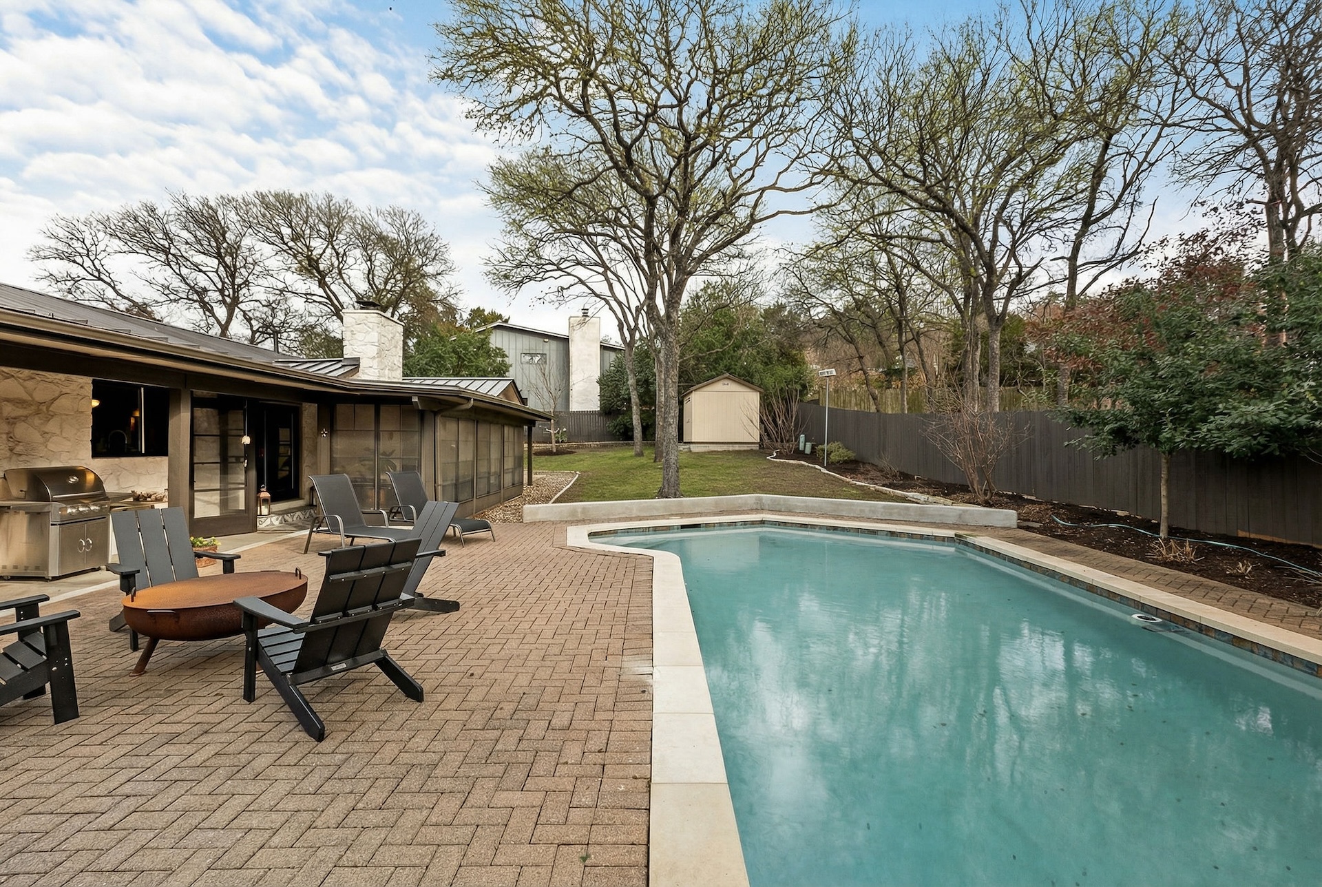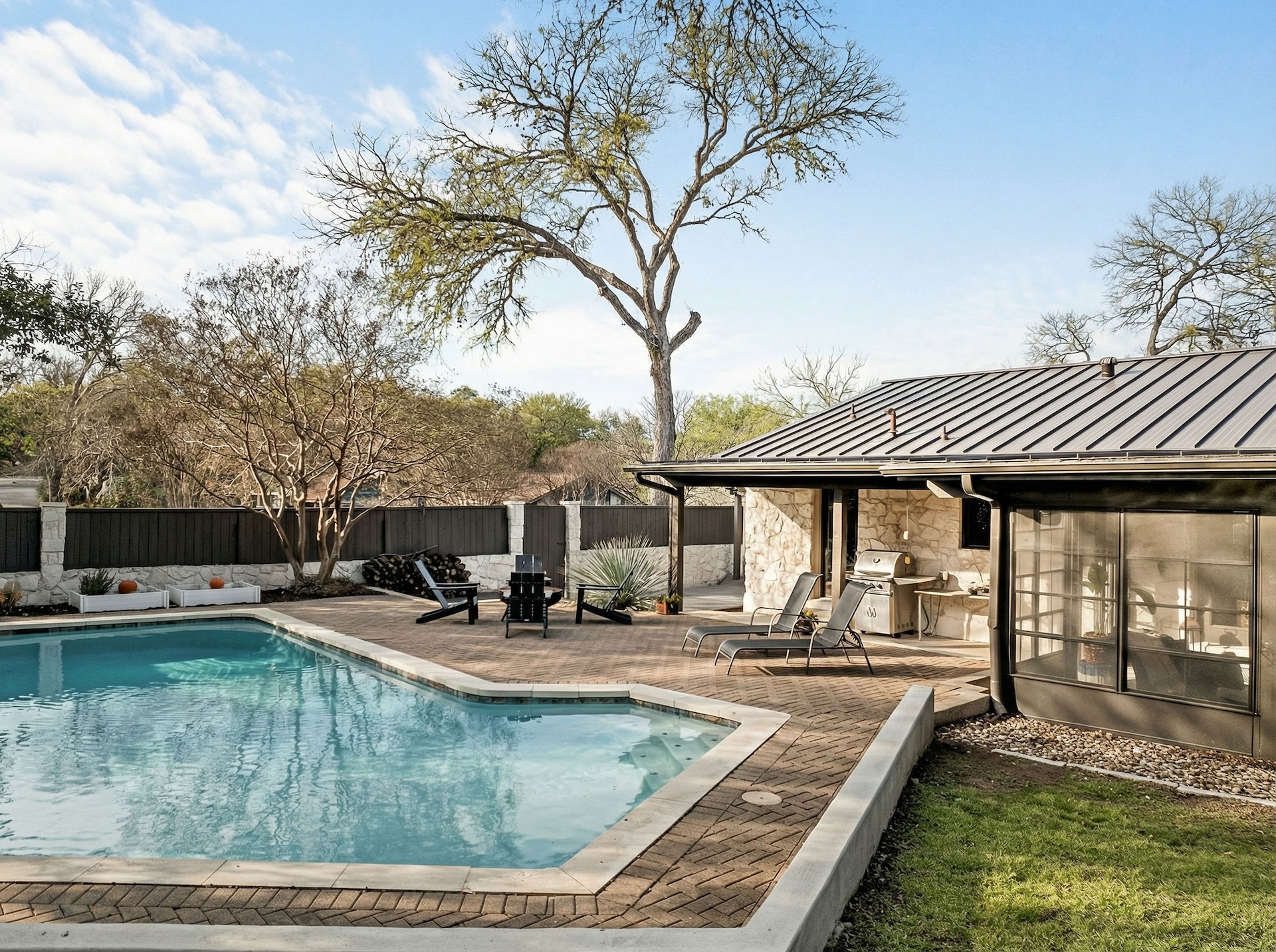 Quietly tucked away on a cul-de-sac in the heart of 78704, this beautifully remodeled single-story home offers exceptional indoor–outdoor living, timeless materials, and a layout designed for both comfort and entertaining. Wrapped in classic limestone with a standing-seam metal roof and mature trees, the home feels private and inviting. Inside, wide-plank wood floors, recessed lighting, and an open floor plan connect multiple living and dining spaces. The main living area features a striking modern fireplace and opens seamlessly to the backyard, creating a natural extension of the home for everyday living and gatherings alike. The gourmet kitchen anchors the home with custom cabinetry, quartz countertops, a generous center island with seating, premium stainless appliances, and a gas range with vent hood. Thoughtful design details and abundant storage make this space as functional as it is beautiful. The primary suite is spacious and serene, offering room for a sitting area and ensuite bath with dual vanity and a glass-enclosed shower. Additional bedrooms are well-proportioned and filled with natural light, complemented by an updated guest bath with timeless finishes. This property has 2 opportunities for a home office / studio. There is a dedicated home office with built-in shelving inside the home, and an additional space accessed by a private entrance that is perfect for an office or workshop and has central HVAC. The oversized laundry room adds rare convenience with cabinetry, counters, and utility sink. Step outside to a true backyard retreat: a sparkling pool, expansive stone patio, pergola-covered dining area, fire pit seating, and a screened-in porch—ideal for year-round enjoyment. Surrounded by mature trees and thoughtful landscaping, the outdoor spaces offer privacy, shade, and a resort-like feel rarely found this close to downtown. Just minutes from Zilker Park, Barton Springs, South Lamar, and all that central Austin has to offer, 2505 Side Cove combines architectural character, modern comfort, and an unbeatable 78704 location. Please call today for a private appointment.