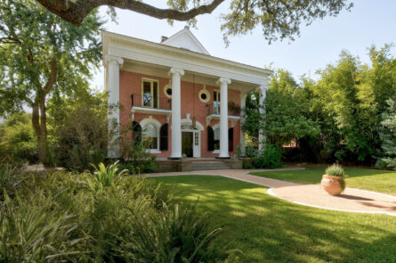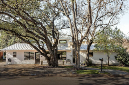 The primary suite is enhanced by a sliding glass door that allows natural light to flow in while remaining partially frosted for privacy. A custom Maxwell’s Closet system provides thoughtful storage. Both bathrooms have been updated with St. Laurent marble vanity tops and tub valances, glass shower panels, and pull-bar accessibility.
