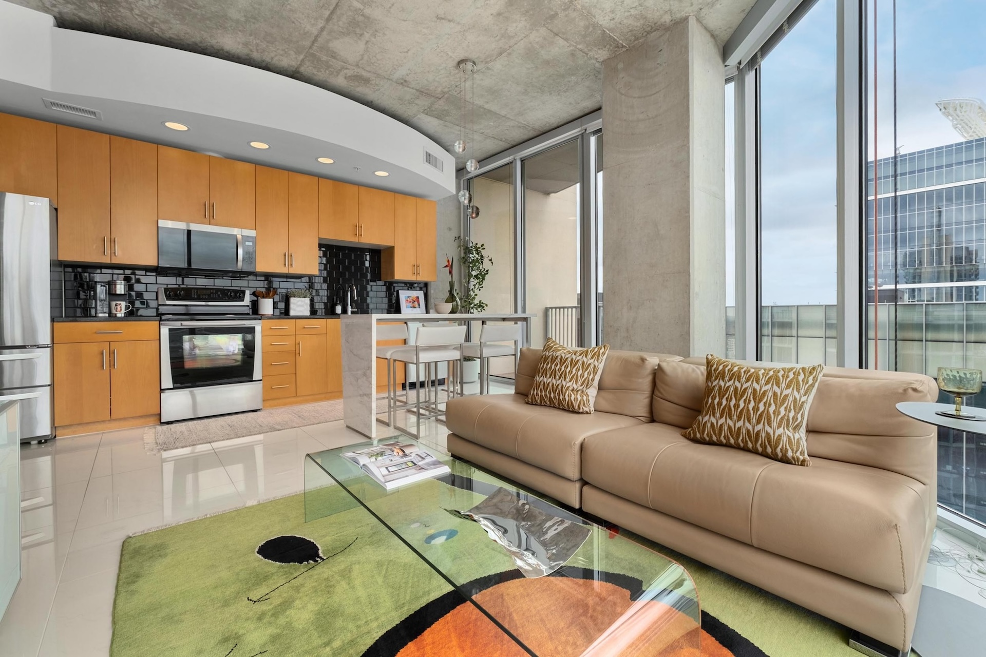 The light-filled, open floor plan is ideal for everyday living and entertaining. The kitchen features upgraded stainless steel appliances along with a stainless steel drawer system installed in the pantry and base cabinets for exceptional storage. A custom marble and stainless-steel dining island with stools anchors the space, while a custom floor-to-ceiling wine rack with accent lighting adds a striking architectural feature. Remote-controlled motorized shades in the living room help manage afternoon sun, with coordinating roller shades in the primary bedroom. Two private balconies offer multiple points to enjoy the breathtaking views.